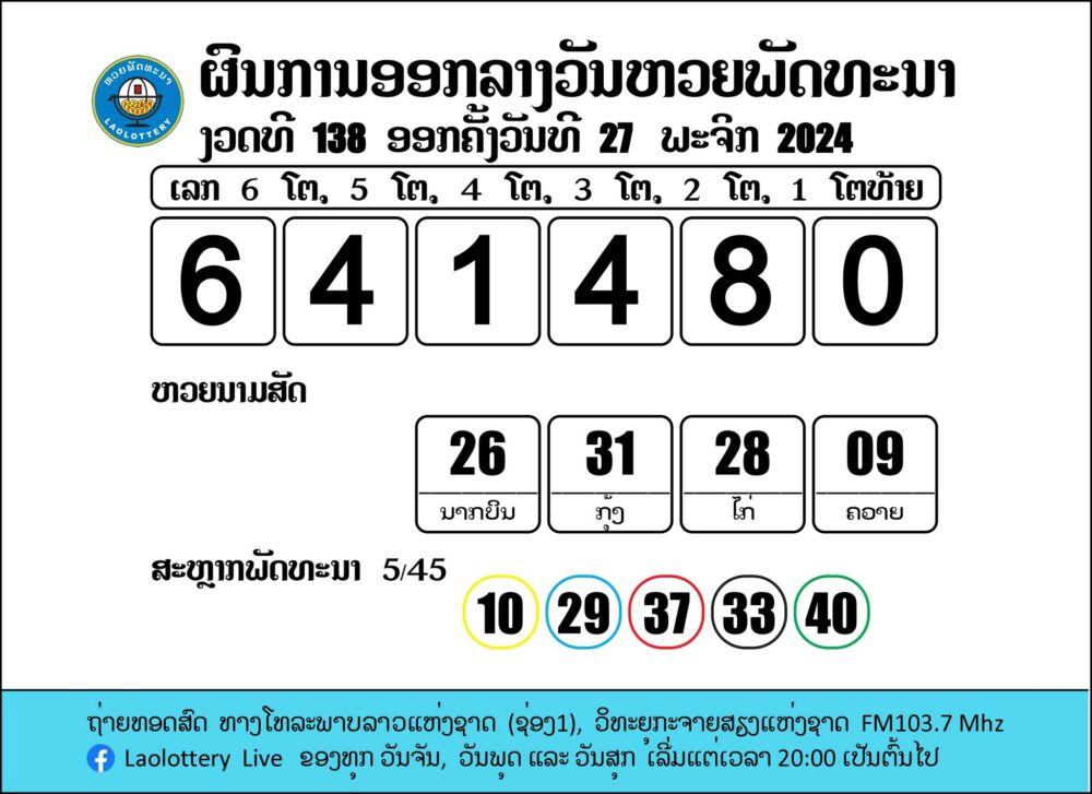 ຖ່າຍທອດສົດການອອກເລກລາງວັນຫວຍພັດທະນາ 27/11/2024