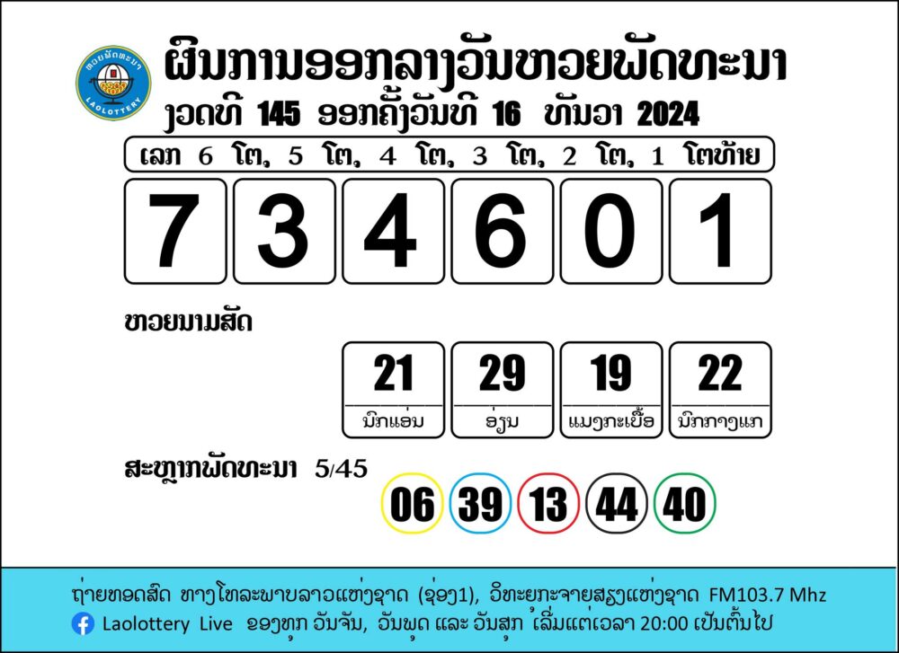 ຖ່າຍທອດສົດການອອກເລກລາງວັນຫວຍພັດທະນາ 16/12/2024