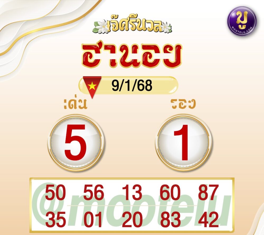 ต่อมาคือ เจ๊ศรีนวล สำนักที่แฟนหวยหลายคนให้ความไว้วางใจ วันนี้เจ๊ศรีนวลให้เลขเด่น 5 และเลขรอง 1 พร้อมแนะนำเลขสองตัวอย่าง 50, 56 และ 35 ที่ถือว่าน่าสนใจมาก ใครที่ยังไม่มีเลขในใจ ลองใช้แนวทางนี้ดูนะครับ!