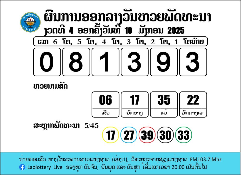 ຖ່າຍທອດສົດການອອກເລກລາງວັນຫວຍພັດທະນາ 10/1/2025