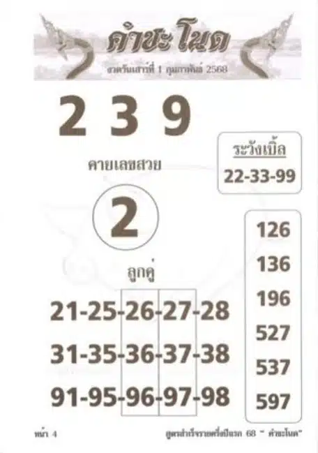 - เลขท้ายสามตัว: 126 – 136 – 196 – 527 – 537 – 597
