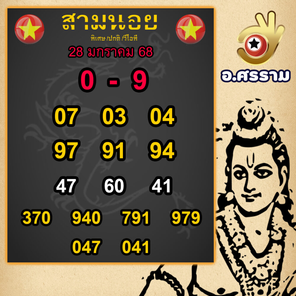 ปิดท้ายด้วย อาจารย์ศรราม สำนักที่ขึ้นชื่อเรื่องความแม่นยำระดับตำนาน วันนี้มาเน้นไปที่เลขเด่น 0 และเลขรอง 9 โดยแนะนำเลขสองตัวที่น่าจับตามองอย่าง 07, 03, 04 และเลขสามตัวที่น่าสนใจ เช่น 370, 940, 791 ถือเป็นชุดเลขที่ไม่ควรมองข้าม!