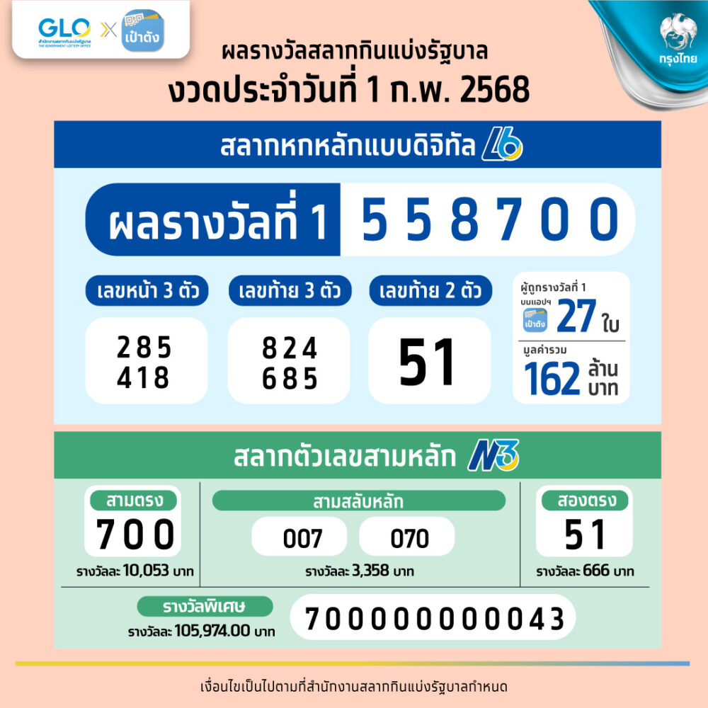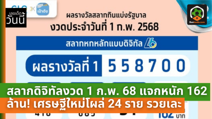 สลากดิจิทัลงวด 1 ก.พ. 68 แจกหนัก 162 ล้าน! เศรษฐีใหม่โผล่ 24 ราย รวยเละผ่านแอปฯ เป๋าตัง