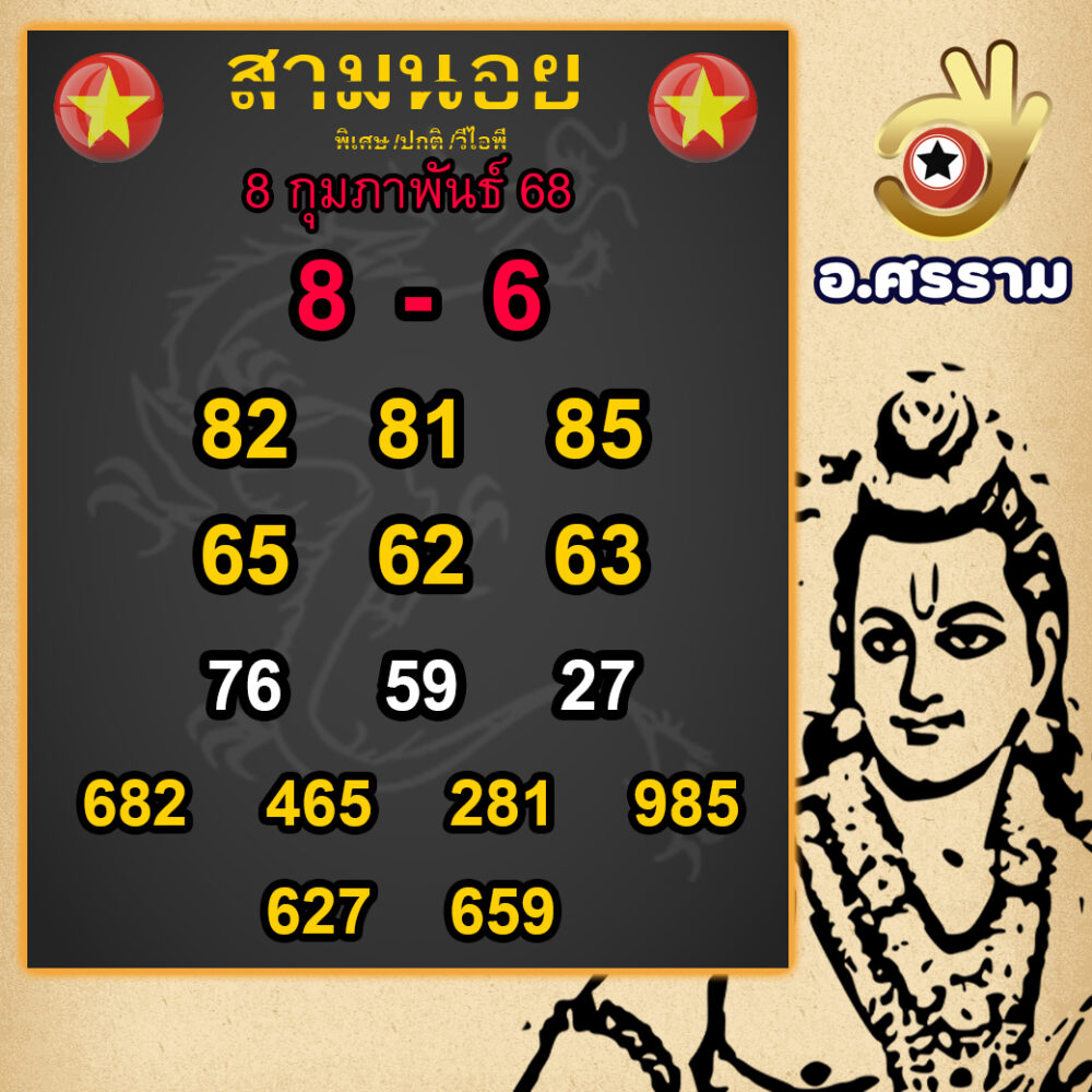 - อาจารย์ศรราม: เด่น 8, รอง 6 พร้อมเลขสามตัวเด็ดอย่าง 682, 465, 281