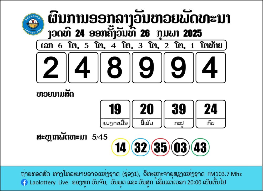 ຖ່າຍທອດສົດການອອກເລກລາງວັນຫວຍພັດທະນາ 26/2/2025
