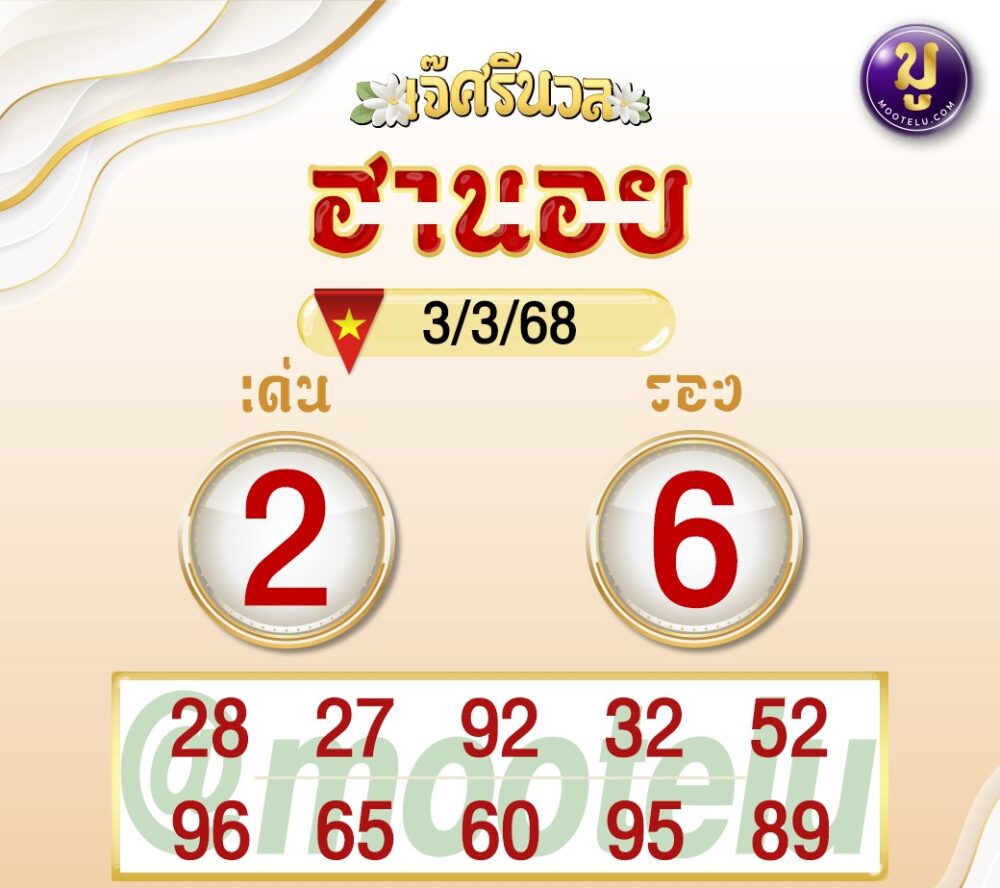- เจ๊ศรีนวล: เด่น 2, รอง 6 โดยมีเลขเด่น 28, 92, 96 ที่คอหวยต้องจับตา