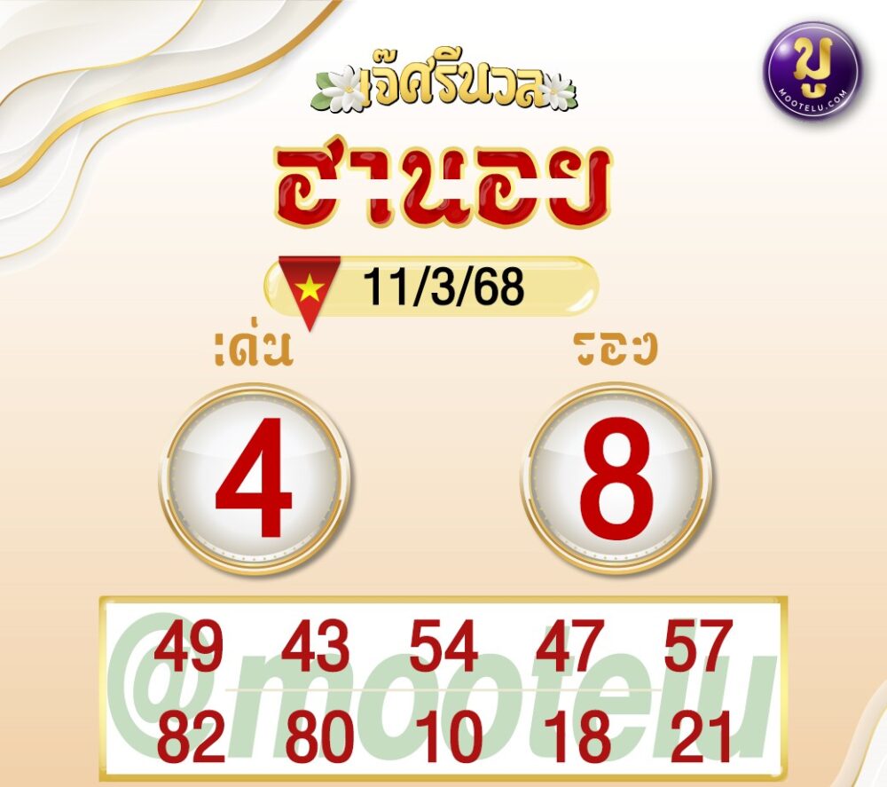 ทางด้าน เจ๊ศรีนวล วันนี้เน้นเลข 4 เป็นเลขเด่น และ 8 เป็นเลขรอง เลขที่ดูจะโดดเด่นเป็นพิเศษคือ 49, 43, 54 ส่วนเลขรองที่มาแรง ได้แก่ 82, 80, 10 ซึ่งเป็นตัวเลือกที่น่าสนใจในวันนี้