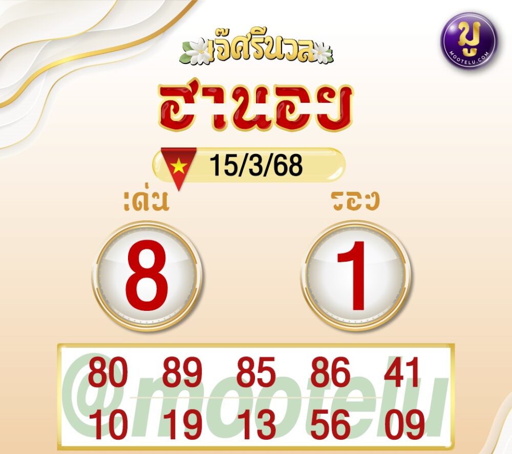 ทางด้าน เจ๊ศรีนวล วันนี้เน้นเลข 8 เป็นเลขเด่น และ 1 เป็นเลขรอง เลขที่ดูจะโดดเด่นเป็นพิเศษคือ 80, 89, 85 ส่วนเลขรองที่มาแรง ได้แก่ 10, 19, 13 ซึ่งเป็นตัวเลือกที่น่าสนใจในวันนี้