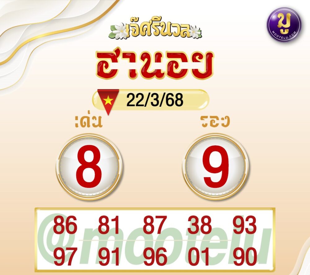 เจ๊ศรีนวล ชูเลข 8 เป็นเด่น โดยมีชุดเลขเด็ดเน้น ๆ อย่าง 86, 81, 87 พร้อมเลขรองที่มาแรงไม่แพ้กันอย่าง 91, 93, 96