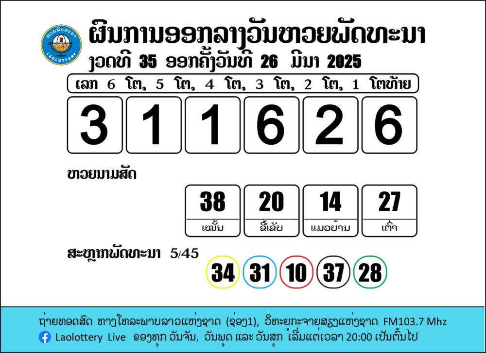 ຖ່າຍທອດສົດການອອກເລກລາງວັນຫວຍພັດທະນາ 26/3/2025