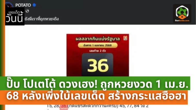 ดวงปังแรงไม่หยุดสำหรับ ปั๊บ โปเตโต้ หรือ พัฒน์ชัย ภักดีสู่สุข นักร้องนำวงร็อกชื่อดัง โปเตโต้ (POTATO) เจ้าของบทบาท พระดล ในซีรีส์ฮิต สาธุ ที่สร้างความประทับใจให้กับแฟน ๆ ทั่วประเทศ ล่าสุดเจ้าตัวได้ออกมาประกาศข่าวดีผ่าน เฟซบุ๊กเพจ POTATO เมื่อวันที่ 1 เมษายน 2568 ว่าตนเองถูกหวย เลขท้ายสองตัว 36 ในงวดนี้ ทำเอาแฟนคลับและเหล่า คอหวย ต่างพากันฮือฮาและแห่แสดงความยินดีกันอย่างคับคั่ง เรียกได้ว่าโชคดีรับ April Fool’s Day แบบไม่ต้องหลอกลวงใด ๆ