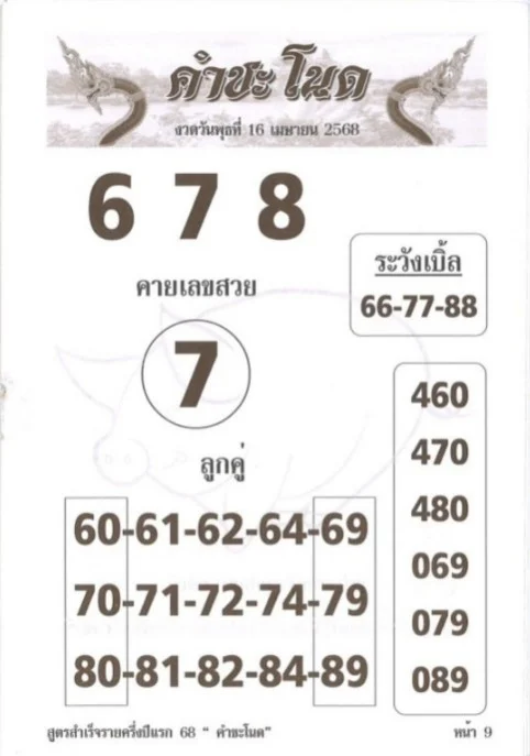 สำหรับเลขสองตัวท้ายที่แนะนำให้จับตา ได้แก่ 60 – 61 – 62 – 64 – 69 – 70 – 71 – 72 – 74 – 79 – 80 – 81 – 82 – 84 – 89 ซึ่งแต่ละตัวมีแนวโน้มเข้าเป้าสูง โดยเฉพาะกลุ่มเลข 70–79 ที่ถือว่ามาแรงมากในงวดนี้ เพราะสอดคล้องกับกระแสพญานาคออกเลขตามจังหวะธรรมชาติของฤดูร้อน นอกจากนี้ เลขสามตัวที่ถูกนำมาชี้แนวทางเพิ่มเติม ได้แก่ 460 – 470 – 480 – 069 – 079 – 089 โดยเฉพาะชุด 460 และ 480 ที่เคยเข้าเป้ามาแล้วในหลายงวดที่ผ่านมา
