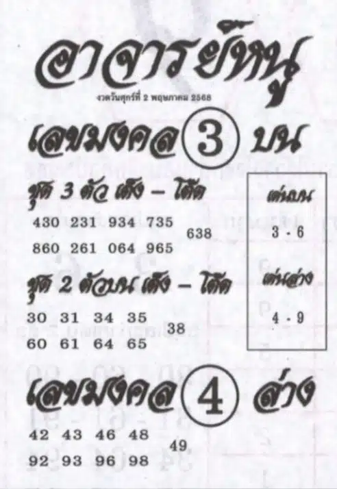 นอกจากเลขมงคลแล้ว แนวทาง เลขเด่น ที่น่าสนใจประจำงวดนี้ ได้แก่ 3 – 6 – 4 – 9 โดยอาจารย์หนูได้นำไปจับคู่เพื่อให้แนวทางแบบลงลึกมากขึ้น พร้อมสรุปเป็นชุดเลขท้าย 2 ตัว และ 3 ตัว เพื่อให้ง่ายต่อการพิจารณาและเลือกซื้อลอตเตอรี่