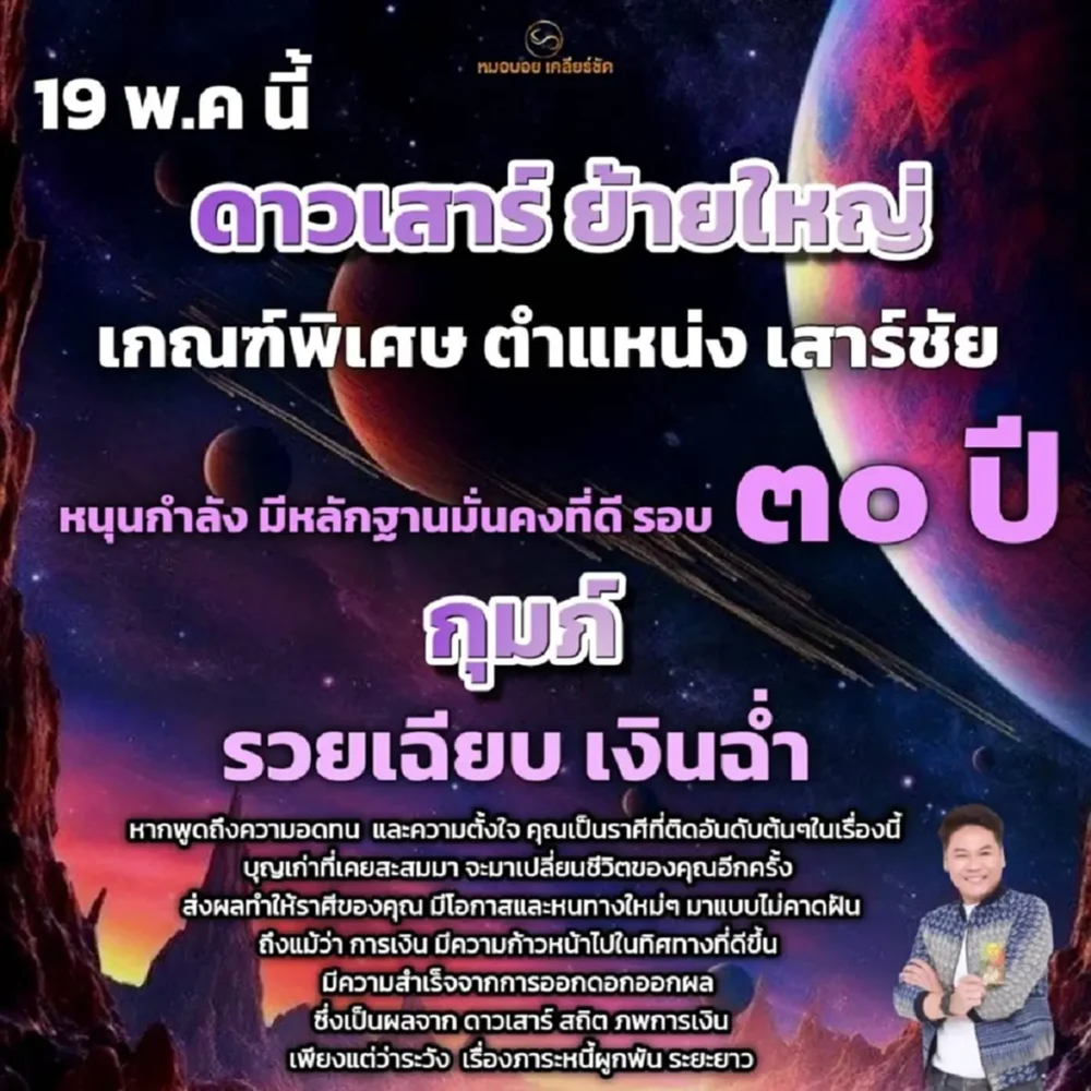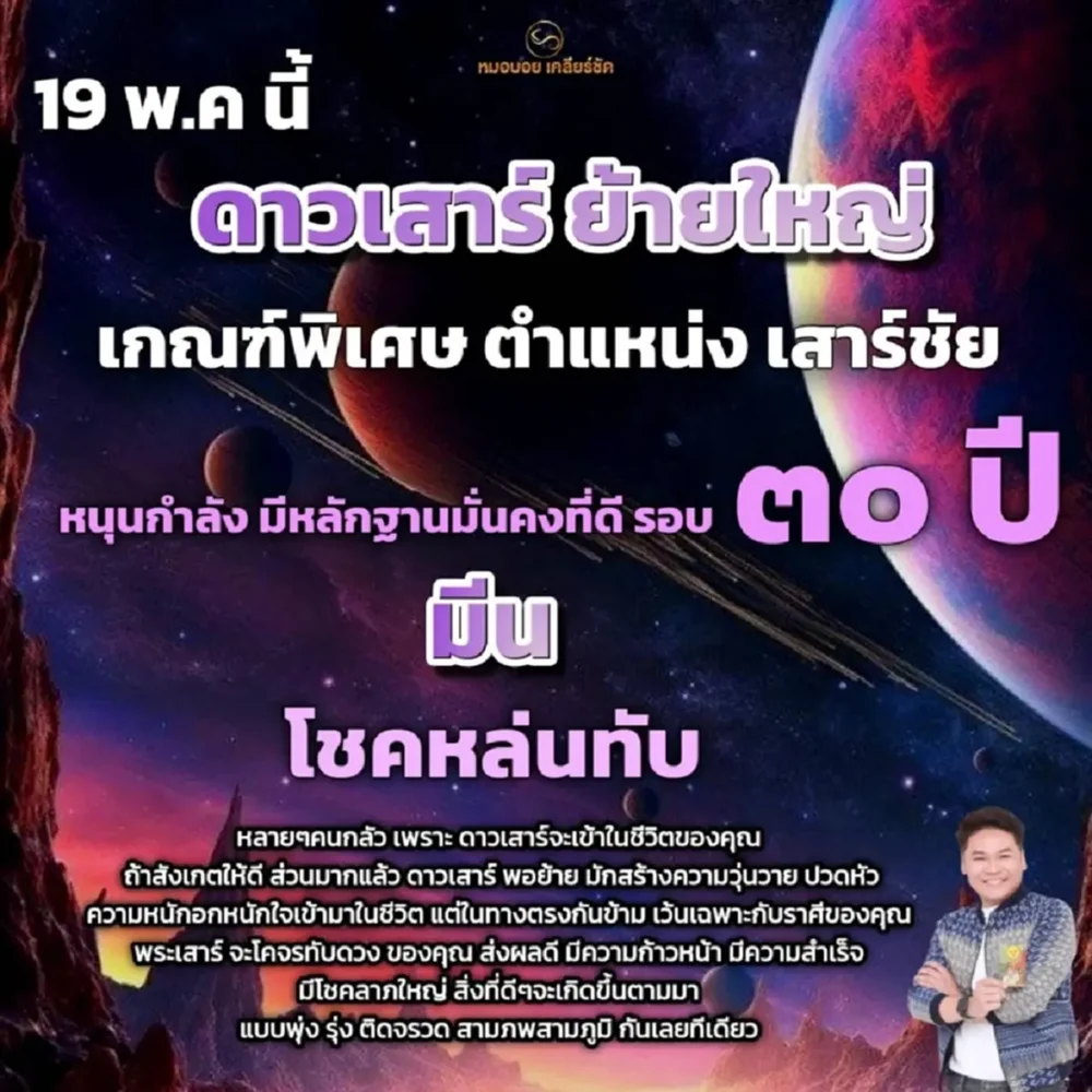 ในทางโหราศาสตร์ไทย การเคลื่อนย้ายของดาวเสาร์ถือเป็นจังหวะที่มีผลต่อดวงชะตาอย่างชัดเจน และในวันที่ 19 พฤษภาคม 2568 ดาวเสาร์จะโคจรเปลี่ยนราศีอีกครั้ง ซึ่งรอบนี้เป็นการย้ายเข้าสู่ตำแหน่งพิเศษที่เรียกว่า “เสาร์ชัย” เป็นจังหวะทรงพลังที่จะส่งผลบวกมหาศาลให้กับบางลัคนาราศีโดยตรง โดยเฉพาะ 3 ราศีต่อไปนี้ ที่หมอบอย เคลียร์ชัด เผยว่าดวงจะเปลี่ยนไปในทางที่ดีแบบก้าวกระโดด โชคลาภหล่นทับ เงินทองพุ่งเข้ามาไม่ขาดมือ ถือเป็นการย้ายครั้งสำคัญในรอบ 30 ปี ที่จะทำให้หลายชีวิตเปลี่ยนแปลงอย่างไม่คาดฝัน