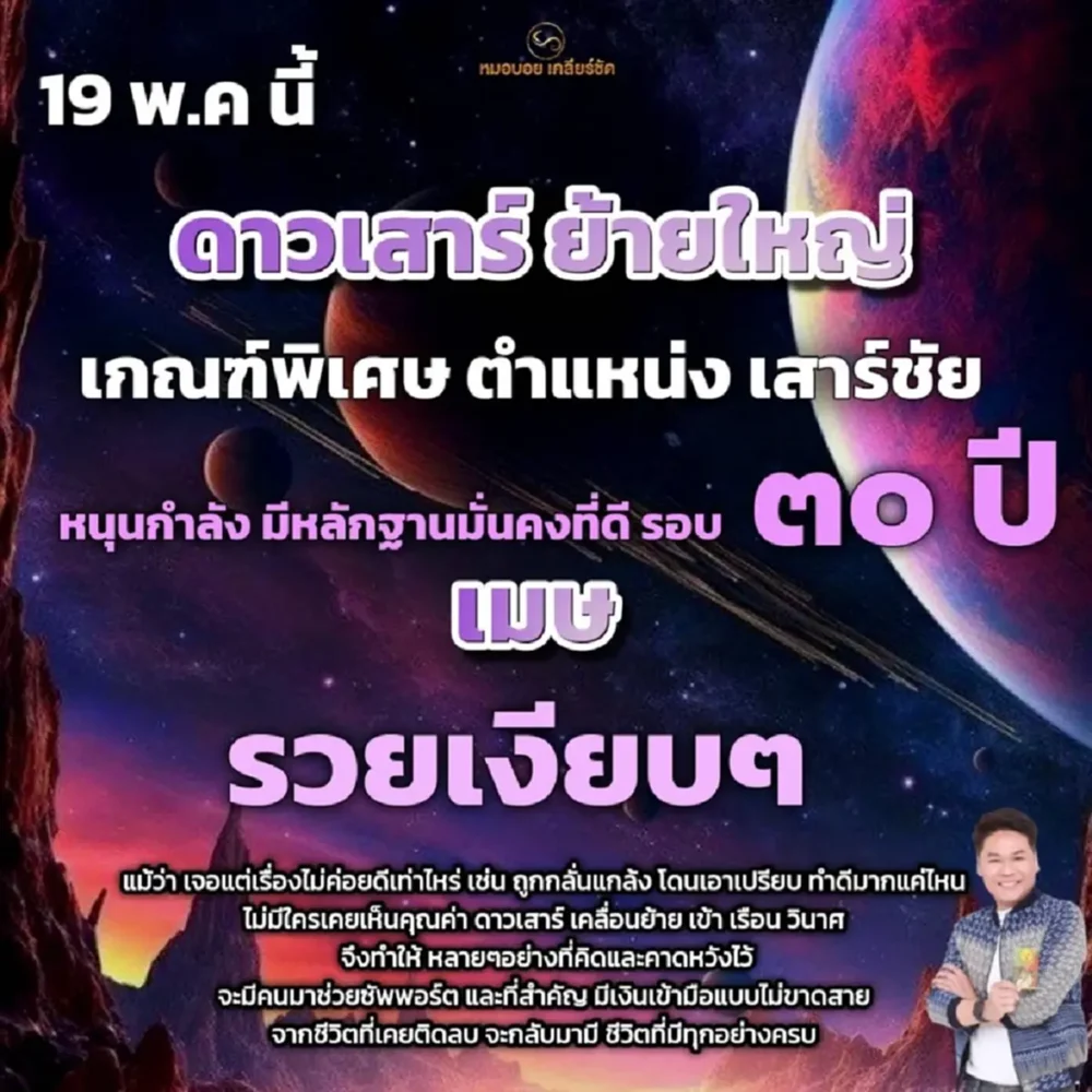 แม้ดาวเสาร์จะย้ายเข้าเรือนวินาศของราศีเมษ ซึ่งในทางโหราศาสตร์อาจเป็นตำแหน่งที่กดดัน แต่ผลที่ตามมาคือการ เปิดเผยตัวช่วยที่ซ่อนอยู่ จากชีวิตที่เคยโดนกลั่นแกล้ง ถูกเอาเปรียบ หรือทำดีแต่ไม่มีใครเห็นคุณค่า วันนี้คุณจะมีคนคอยยื่นมือช่วยเหลือแบบไม่เปิดเผย รายได้จะหลั่งไหลเข้ามาแบบเงียบ ๆ โดยไม่ต้องโฆษณาให้ใครรู้ แม้จะไม่ได้ปังแบบทันตาเห็น แต่เป็นความมั่นคงที่สร้างได้จริง เบื้องหลังที่คุณอดทนมาอย่างเงียบ ๆ จะกลายเป็นรากฐานให้รวยอย่างมั่นคงและไม่สะดุดอีกต่อไป