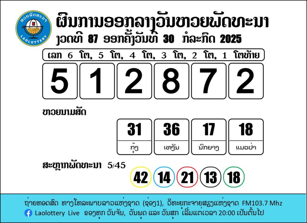 ตรวจหวยลาว (ຫວຍລາວ) งวดประจำวันที่ 30/07/2568