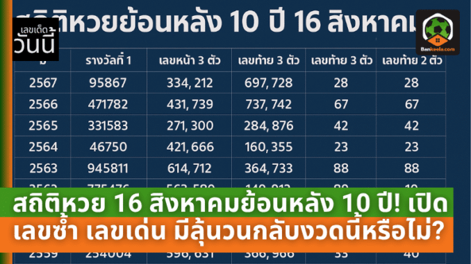 ขุดลึกสถิติหวย 16 สิงหาคมย้อนหลัง 10 ปี! เปิดโพยเลขซ้ำ เลขเด่น เลขเบิ้ล มีลุ้นวนกลับงวดนี้หรือไม่?