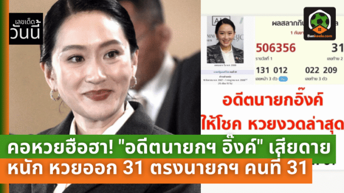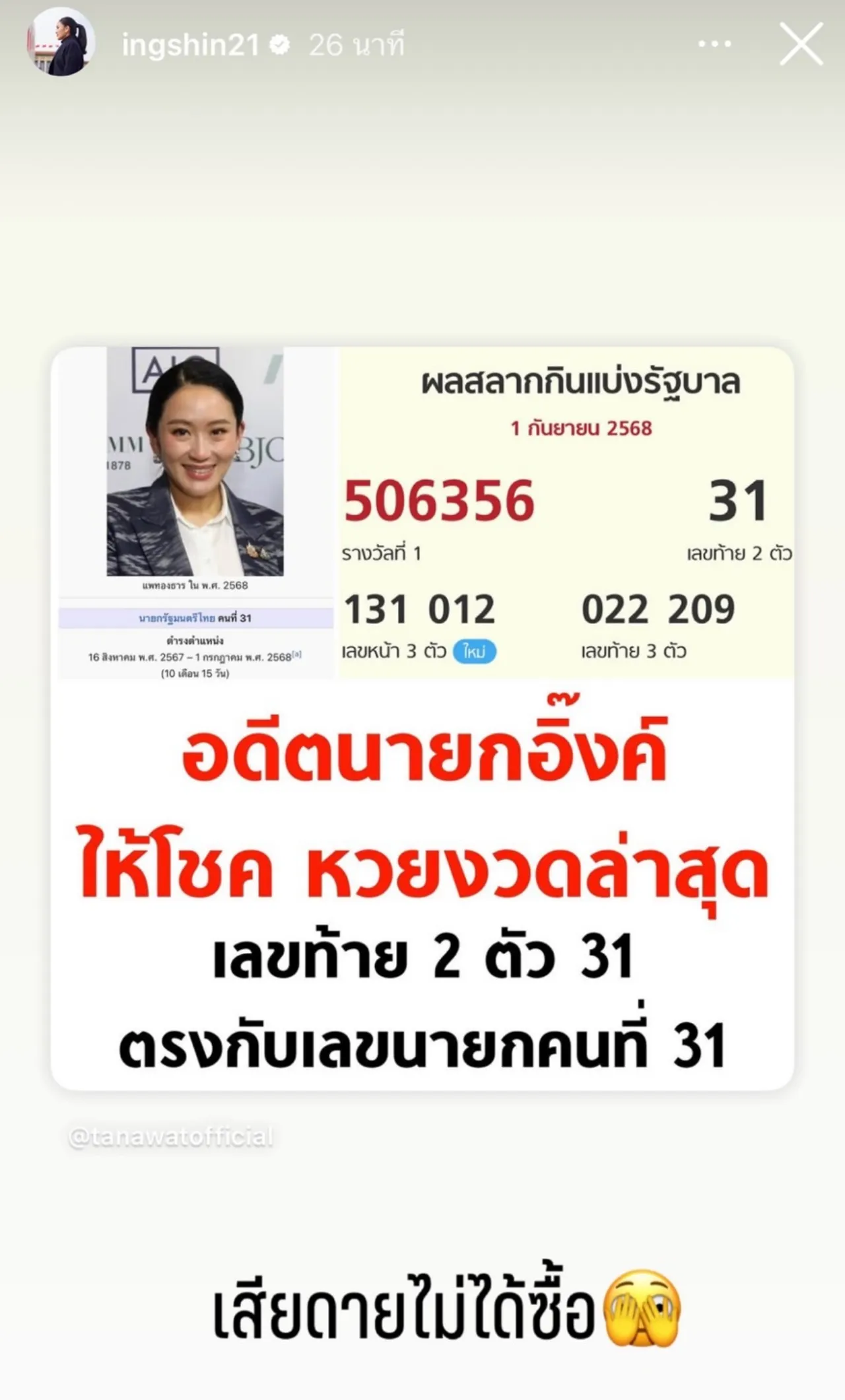 กลายเป็นกระแสร้อนแรงในหมู่คอหวยทันที เมื่อ อดีตนายกฯ อิ๊งค์ แพทองธาร ชินวัตร โพสต์ผ่านสตอรี่ไอจีหลังผลสลากกินแบ่งรัฐบาลงวดประจำวันที่ 1 กันยายน 2568 ออกมา โดยเลขท้าย 2 ตัวคือ 31 ซึ่งไปตรงกับ นายกรัฐมนตรีคนที่ 31 ของไทยอย่างพอดิบพอดี งานนี้เจ้าตัวถึงกับบอกว่า “เสียดายไม่ได้ซื้อ”