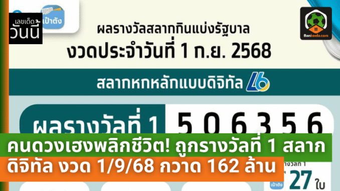 ผู้สื่อข่าวรายงานว่า หลังจากสำนักงานสลากกินแบ่งรัฐบาลประกาศผลการออกรางวัล งวดประจำวันที่ 1 กันยายน 2568 โดย รางวัลที่ 1 ออกหมายเลข 506356 ส่วนรางวัลเลขหน้า 3 ตัว ได้แก่ 131 และ 012 ขณะที่เลขท้าย 3 ตัวคือ 022 และ 209 และเลขท้าย 2 ตัวได้แก่ 31 ผลการออกรางวัลครั้งนี้ทำให้มีเศรษฐีใหม่เพิ่มขึ้นทันตา