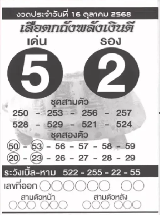 สำหรับแนวทางล่าสุดจาก สำนักเสือตกถังพลังเงินดี งวด 16/10/68 มีการแจกชุดเลขครบทั้ง เลขเด่น เลขรอง และชุดเสริมสำหรับวิเคราะห์เพิ่มเติม โดยงวดนี้เลขที่โดดเด่นที่สุดคือ 5 และเลขรองที่ไม่ควรมองข้ามคือ 2 ซึ่งถือเป็นคู่ตัวเลขที่ได้รับความนิยมอย่างสูงในช่วงนี้
