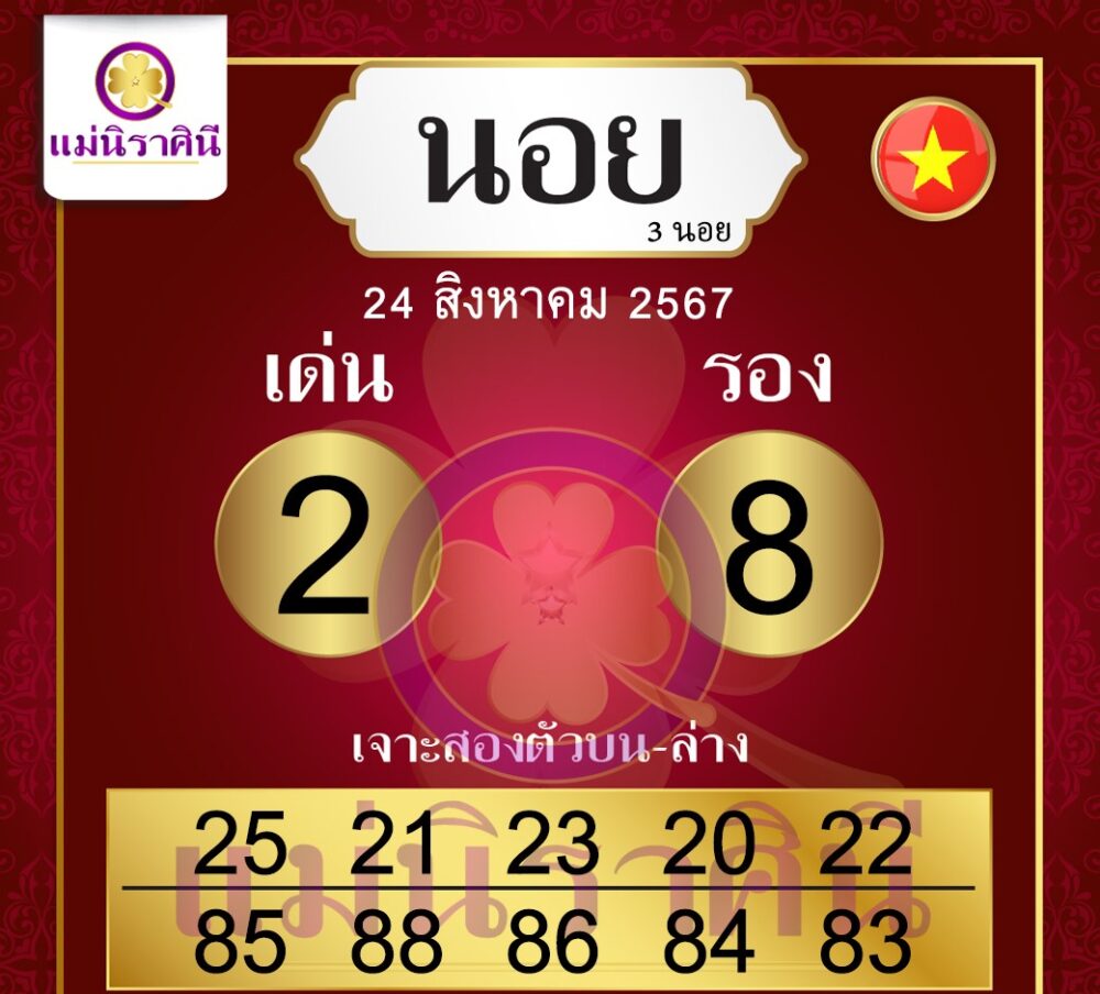 แม่นิราศินีแนะนำเลขเด่น 2 และเลขรอง 8 ซึ่งเป็นเลขที่คัดสรรมาอย่างพิถีพิถัน โดยเฉพาะชุดเลขสองตัวบน-ล่างที่แนะนำ ได้แก่ 25, 21, 23, 88, และ 86 ซึ่งมีโอกาสสูงในการออกรางวัลในวันนี้