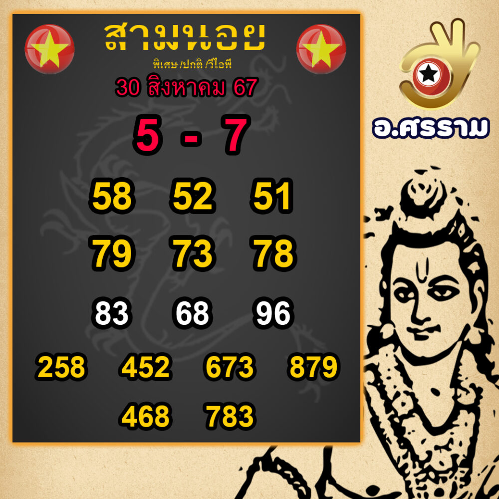 อาจารย์ศรรามเน้นให้ความสำคัญกับเลขเด่น 5 และเลขรอง 7 ซึ่งมีการผสมผสานกันเพื่อเพิ่มโอกาสในการถูกรางวัล ชุดเลขสองตัวที่แนะนำได้แก่ 58, 52, 79, และ 68 ที่ควรนำมาเสี่ยงโชคในวันนี้