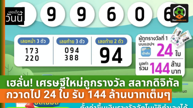 ยินดีกับเศรษฐีใหม่ป้ายแดงที่ดวงเฮงอย่างสุดๆ ในงวดนี้ เมื่อมีผู้โชคดีถูกรางวัลที่ 1 ของ สลากดิจิทัล งวดประจำวันที่ 1 กันยายน 2567 หมายเลขที่นำโชคคือ 199606 ซึ่งถูกรวมทั้งสิ้นถึง 24 ใบ คิดเป็นเงินรางวัลสูงถึง 144 ล้านบาท!