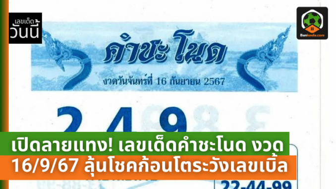 ใกล้เข้ามาแล้วกับการประกาศ ผลสลากกินแบ่งรัฐบาล งวดวันที่ 16 กันยายน 2567 คอหวยทั่วประเทศต่างเริ่มเสาะหา เลขเด็ด เพื่อเสี่ยงโชคลุ้นรางวัลใหญ่อย่างตื่นเต้น ไม่ว่าจะเป็นเลขจากคนดัง เลขเด็ดจากโซเชียล หรือแม้แต่ เลขเด็ดจากปฏิทินจีน ซึ่งได้รับความสนใจอย่างล้นหลาม โดยเฉพาะเลขเด็ดจาก คำชะโนด สถานที่ศักดิ์สิทธิ์ที่ขึ้นชื่อเรื่องความแม่นยำในการให้โชคลาภ ครั้งนี้ Sanook News ได้นำลายแทงเลขนำโชคจาก ปู่ศรีสุทโธ และ ย่าศรีปทุมมา แห่งป่าคำชะโนด อำเภอบ้านดุง จังหวัดอุดรธานี มาฝากให้คอหวยทุกคนได้ติดตามอย่างใกล้ชิด
