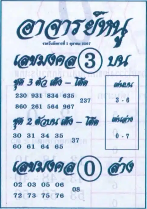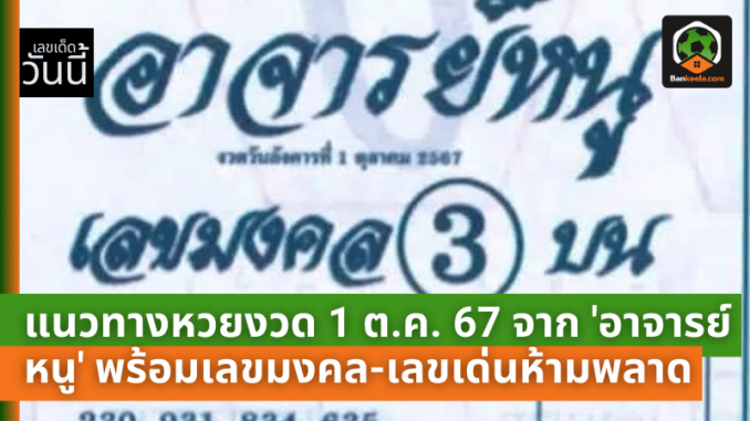 เตรียมตัวกันให้พร้อม! สำหรับคอหวยและนักเสี่ยงโชคทั้งหลาย งวดวันที่ 1 ตุลาคม 2567 นี้ อาจารย์หนู ได้ปล่อยเลขเด็ดมาเรียบร้อยแล้ว โดยงวดนี้เต็มไปด้วยเลขมงคล เลขเด่น และเลขท้าย 2 ตัว 3 ตัว ที่หลายคนตั้งตารอ ใครที่กำลังมองหาแนวทางในการซื้อลอตเตอรี่ในงวดนี้ ห้ามพลาด เพราะเลขของ อาจารย์หนู มักจะถูกจับตาเสมอ โดยเฉพาะเลขที่เน้นความเป็นสิริมงคลและความโชคดี