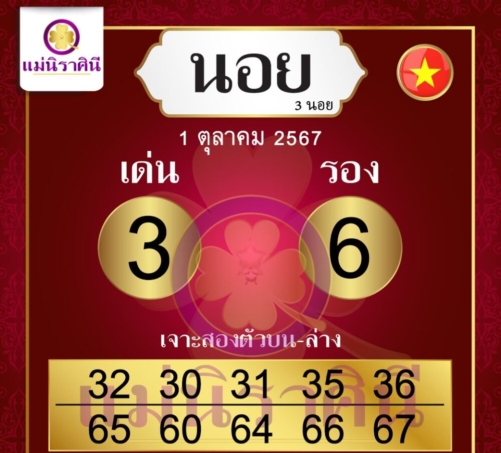 เริ่มต้นด้วยเลขเด็ดจาก แม่นิราศินี วันนี้เลขเด่นคือ 3 และเลขรองคือ 6 โดยมีชุดเลขที่น่าสนใจสำหรับเสี่ยงโชคดังนี้: