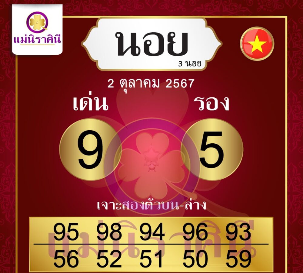 แนวทางจาก แม่นิราศินี วันนี้ เน้นไปที่เลขเด่น 9 และเลขรอง 5 โดยมีเลขที่น่าสนใจดังนี้: