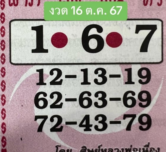 - เลขท้ายสองตัว: 12 – 13 – 19 – 62 – 63 – 69 – 72 – 43 – 79