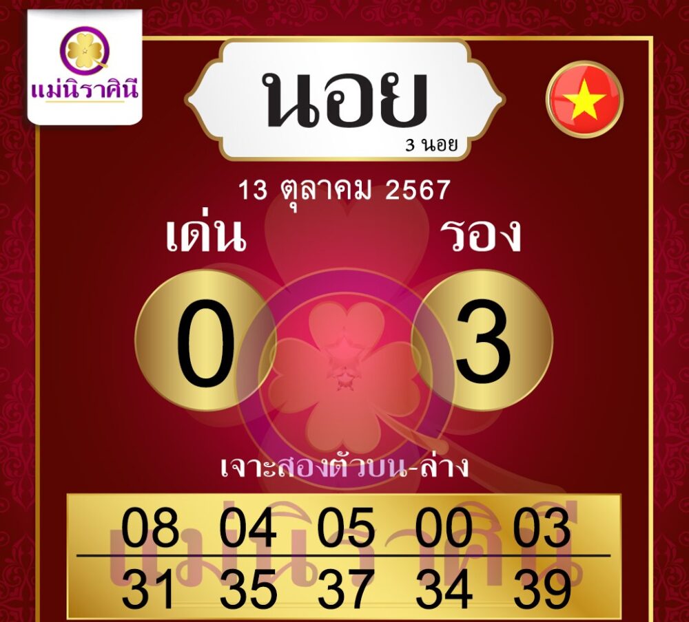 ในงวดนี้ แม่นิราศินี ให้เลขเด่นเป็น 0 ซึ่งเป็นเลขที่มาแรงในหลาย ๆ งวดที่ผ่านมา และเลขรองเป็น 3 ที่มีโอกาสออกมากเช่นกัน ใครที่กำลังมองหาแนวทางการเสี่ยงโชคสามารถนำชุดเลขนี้ไปใช้ลุ้นรางวัลได้เลยครับ
