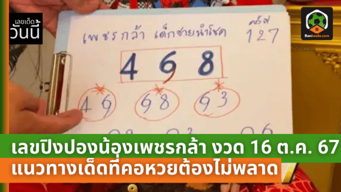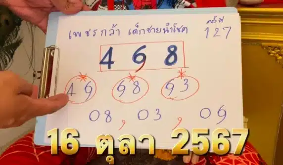 ในงวดนี้ น้องเพชรกล้า ปล่อยทั้ง เลขปิงปอง เลขกัน และเลขเด่น-เลขรองออกมาให้คอหวยได้พิจารณาและเลือกซื้อ ลอตเตอรี่ ในช่วงโค้งสุดท้าย โดยตัวเลขที่ถูกจับออกมานั้นคือ 4, 6 และ 8 แต่เนื่องจากเลข 6 และ 9 มักจะถือว่าเป็นเลขตัวเดียวกัน ทำให้แนะนำให้คอหวยกลับหัวเผื่อไว้ในการลุ้นโชคครั้งนี้ ซึ่งอาจทำให้มีโอกาสถูกรางวัลใหญ่มากขึ้น