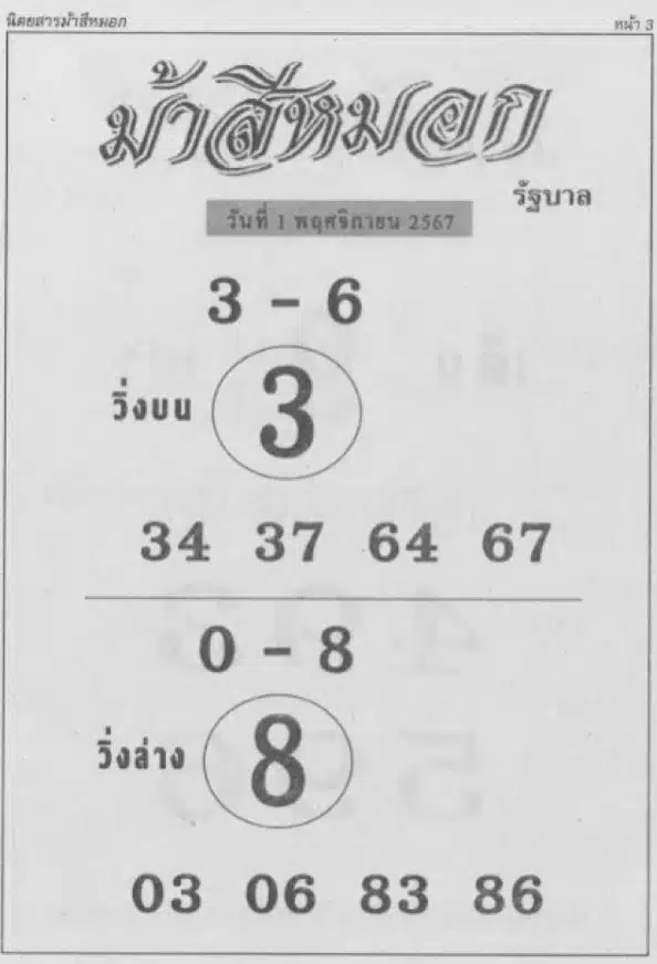 ในงวดนี้ ม้าสีหมอกได้ทำนายเลขเด่นและเลขสองตัวท้ายที่เน้นหนักอย่างเต็มที่ เลขที่นำมาเสนอให้ในงวดนี้ยังคงรูปแบบเดิมที่แฟนหวยคุ้นเคย โดยให้ความสำคัญกับเลขเด่นเป็นหลัก ซึ่งคราวนี้เน้นเลข 3 และ 8 ที่เชื่อว่าจะนำพาโชคลาภมาให้ผู้ที่ศรัทธา บวกกับเลขรองอย่าง 6 และ 0 ที่เสริมดวงชะตาให้มั่นคง