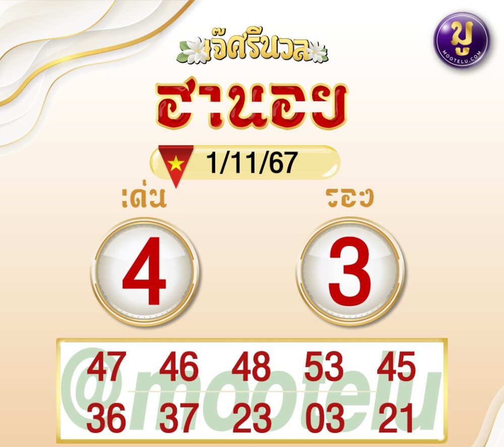 เจ๊ศรีนวลให้เลขเด่นเป็นเลข 4 และรอง 3 เน้นเลขคู่ 47 และ 46 ที่ดูมีความน่าสนใจ และน่าลองเสี่ยงโชคในวันนี้ครับ