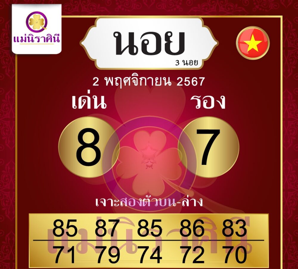 สำหรับแนวทางจาก แม่นิราศินี งวดนี้ให้เด่นไปที่เลข 8 และรอง 7 โดยมีเลขสองตัวที่น่าสนใจมาก เช่น 85 และ 87 ที่ควรเก็บไว้พิจารณาเป็นพิเศษครับ