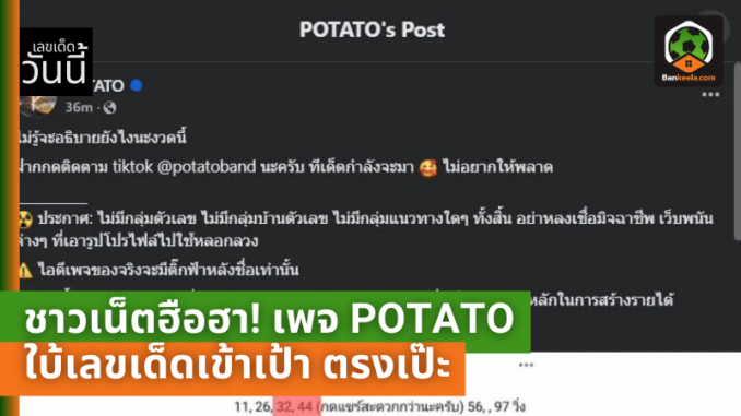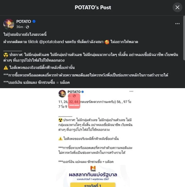 โพสต์ของเพจ POTATO ครั้งนี้มาในรูปแบบที่แฝงความตลกและเป็นกันเอง โดยข้อความระบุว่า “ไม่รู้จะอธิบายยังไงนะงวดนี้ ฝากกดติดตาม tiktok @potatoband นะครับ ทีเด็ดกำลังจะมา 🥰 ไม่อยากให้พลาด” พร้อมย้ำเตือนให้แฟนๆ ระมัดระวังการถูกหลอกลวงจากกลุ่มมิจฉาชีพที่นำชื่อหรือภาพโปรไฟล์ไปแอบอ้างในวงการซื้อขายหวย “ประกาศ: ไม่มีกลุ่มตัวเลข ไม่มีกลุ่มบ้านตัวเลข ไม่มีกลุ่มแนวทางใดๆ ทั้งสิ้น อย่าหลงเชื่อมิจฉาชีพ เว็บพนันต่างๆ ที่เอารูปโปรไฟล์ไปใช้หลอกลวง ไอดีเพจของจริงจะมีติ๊กฟ้าหลังชื่อเท่านั้น” เรียกว่าเป็นการออกมาเตือนภัยแฟนๆ ในช่วงที่กระแสการเล่นหวยและการใบ้เลขเด็ดกำลังเป็นที่นิยม