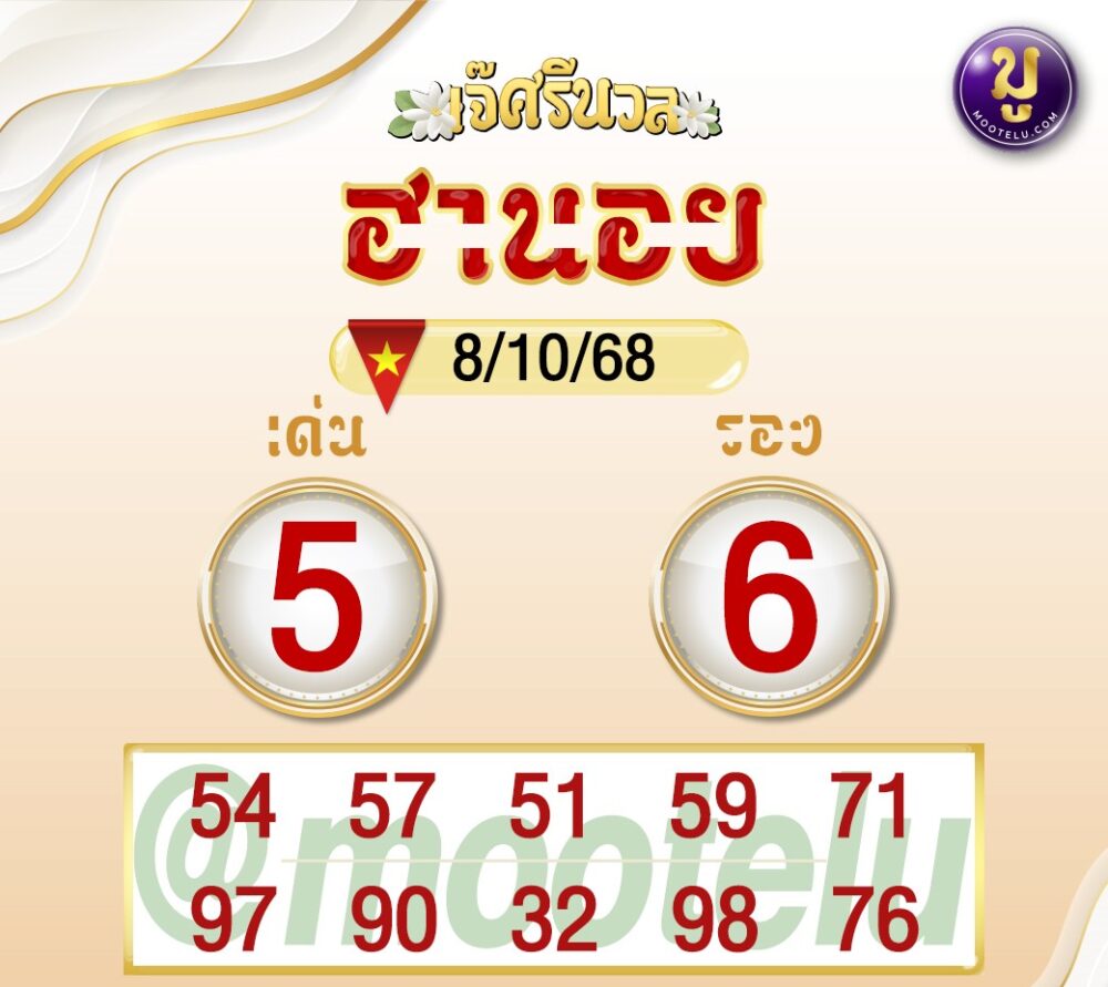 เจ๊ศรีนวล ชี้เป้า 5 เด่น ชูชุดเลขทองเข้ากลุ่มดัง 54, 57, 59 โดยมี 98 เป็นเลขซ้ำที่ชนกับแม่นิราศินี เพิ่มความมั่นใจว่ามีสิทธิ์มาแรงในงวดนี้ นอกจากนี้ 54 และ 97 ยังเป็นเลขเข้าชุดที่ออกบ่อยในรอบสัปดาห์