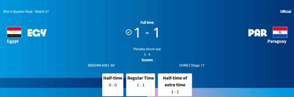 การแข่งขันฟุตบอลโอลิมปิกชาย 2024 รอบก่อนรองชนะเลิศ ระหว่างทีมอียิปต์ กับ ปารากวัย จบลงด้วยผลเสมอ 1-1 ในเวลาปกติและต่อเวลา ก่อนที่ทีมอียิปต์ จะชนะในดวลจุดโทษ 5-4 ผ่านเข้าสู่รอบรองชนะเลิศได้สำเร็จ