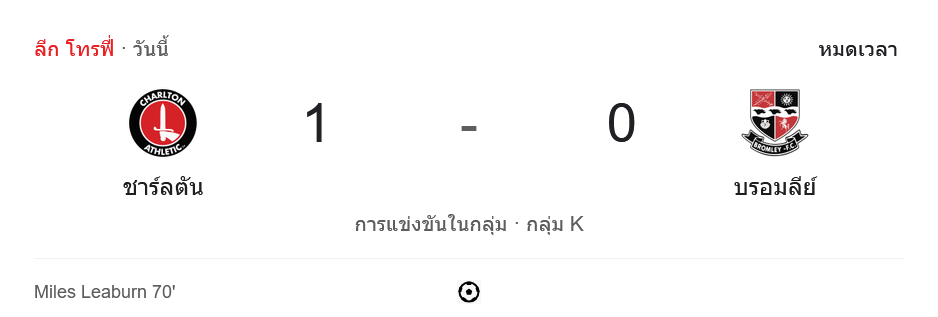ศึก จอห์นสโตนส์ เพนท์โทรฟี่ 2024 กลุ่ม K ระหว่าง ชาร์ลตัน แอธเลติก พบ บรอมลีย์ จบลงด้วยชัยชนะของเจ้าบ้านชาร์ลตัน แอธเลติก ที่สามารถเฉือนเอาชนะไปได้ด้วยสกอร์ 1-0 จากประตูโทนของ ไมล์ส ลีเบิร์น ในนาทีที่ 70 ส่งผลให้ชาร์ลตันเก็บ 3 แต้มเต็ม รักษาตำแหน่งจ่าฝูงของกลุ่มได้อย่างเหนียวแน่น พร้อมทั้งสร้างสถิติชนะรวด 3 นัดติดต่อกันในรอบแบ่งกลุ่ม