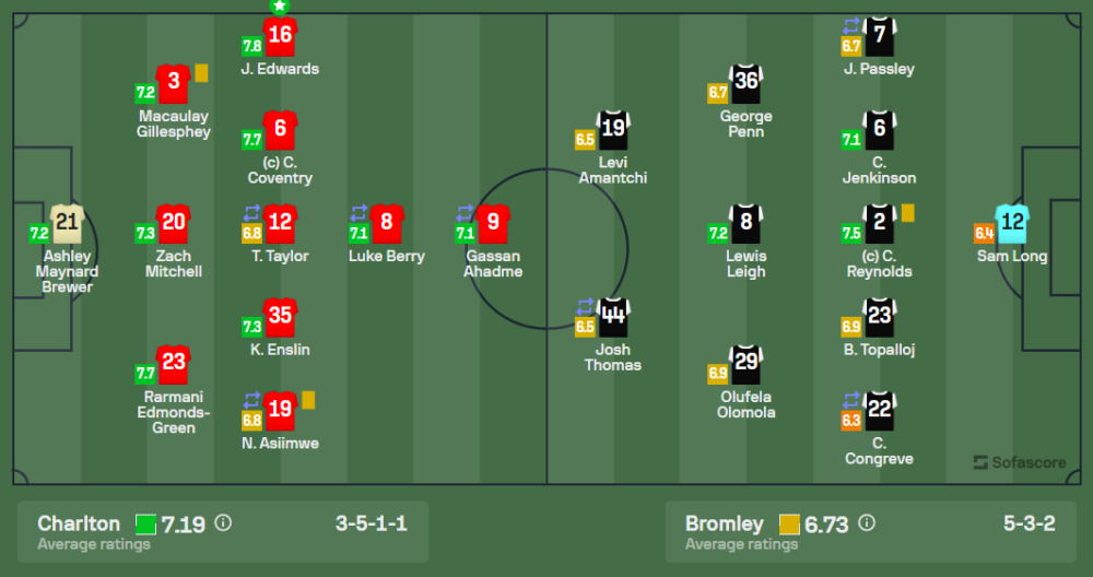 จอช เอ็ดเวิร์ดส์ ของชาร์ลตัน แอธเลติก ได้รับคะแนนสูงสุด 7.8 ทำผลงานได้อย่างยอดเยี่ยมในตำแหน่งกองหลัง มีบทบาทสำคัญในการป้องกันการบุกของบรอมลีย์ และยังช่วยสร้างเกมรุกจากแดนหลังได้ดี