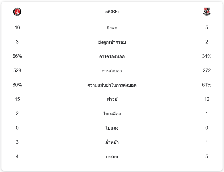ชาร์ลตัน แอธเลติกมีการครองบอลถึง 66% และส่งบอลทั้งหมด 528 ครั้ง โดยมีความแม่นยำ 80% ในขณะที่บรอมลีย์ครองบอลเพียง 34% และส่งบอลเพียง 272 ครั้งเท่านั้น แม้ว่าบรอมลีย์จะมีการป้องกันที่เหนียวแน่น แต่การสร้างเกมรุกกลับน้อยกว่าอย่างชัดเจน ชาร์ลตันยิงทั้งหมด 16 ครั้ง เข้ากรอบ 3 ครั้ง ส่วนบรอมลีย์ยิงเพียง 5 ครั้ง เข้ากรอบ 2 ครั้ง