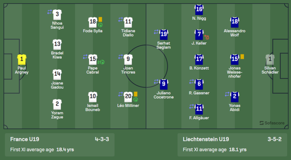 ฝรั่งเศสใช้แผน 4-3-3 โดยมีการกดดันสูงและใช้การโจมตีทางริมเส้นอย่างมีประสิทธิภาพ การเล่นบอลสั้นและความเร็วในการโจมตีสร้างปัญหาให้กับลิคเทนสไตน์ตลอดทั้งเกม ฝั่งลิคเทนสไตน์ใช้แผน 3-5-2 เน้นการตั้งรับลึก แต่ไม่สามารถต้านทานการบุกของฝรั่งเศสได้เลย โดยเฉพาะการเล่นกลางสนามที่ถูกกดดันอย่างหนัก