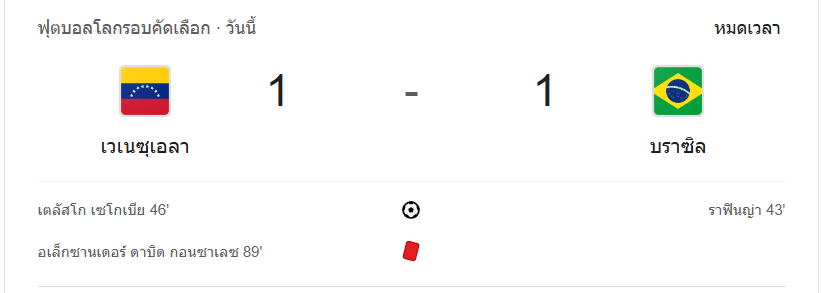 - นาทีที่ 90+7: จบเกม เวเนซุเอลาเสมอกับบราซิล 1-1 แบ่งแต้มกันไปในการแข่งขันที่เต็มไปด้วยความตึงเครียด