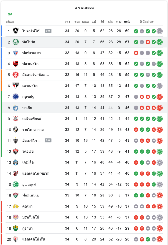 พัลไมรัสเก็บสามแต้มสำคัญเพิ่มขึ้น รวมเป็น 67 คะแนน ยังคงรักษาอันดับสองในตาราง ขณะที่บาเฮียยังอยู่อันดับที่ 8 ด้วย 46 คะแนน ซึ่งยังมีโอกาสต่อสู้เพื่อตำแหน่งที่ดีกว่าในนัดถัดไป
