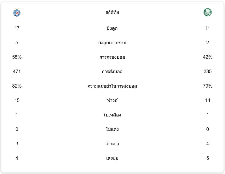 เกมนี้ บาเฮียมีโอกาสยิง 17 ครั้ง โดยยิงเข้ากรอบได้ 5 ครั้ง ขณะที่พัลไมรัสมีโอกาสยิง 11 ครั้ง แต่ยิงเข้ากรอบเพียง 2 ครั้ง บาเฮียครองบอลได้ถึง 58% และมีการส่งบอลทั้งหมด 471 ครั้ง ด้วยความแม่นยำ 82% ส่วนพัลไมรัสมีการครองบอลที่ 42% และส่งบอลทั้งหมด 335 ครั้ง ด้วยความแม่นยำ 79% ฟาวล์ในเกมนี้ค่อนข้างสูสี โดยบาเฮียทำฟาวล์ 15 ครั้ง ขณะที่พัลไมรัสทำฟาวล์ 14 ครั้ง