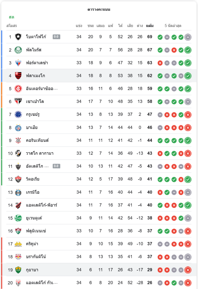 ฟลาเมงโกยังคงรักษาอันดับ 4 ด้วยคะแนน 62 แต้ม มีลุ้นขยับขึ้นไปอยู่ในกลุ่มหัวตาราง ส่วนคุยอาบายังคงอยู่อันดับที่ 19 มีเพียง 29 แต้ม ซึ่งสถานการณ์ยังคงน่าเป็นห่วงในการลุ้นหนีตกชั้น