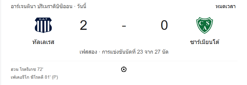 นาทีที่ 90+2 ทัลเลเรสเน้นครองบอลเพื่อประคองเกม ขณะที่ซาร์เมียนโต้พยายามบุกอย่างหนักแต่ยังเจาะแนวรับไม่เข้า