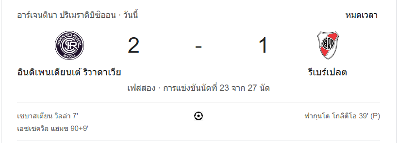 จบเกม อินดิเพนเดนเต้ ลิวาดาเวีย คว้าชัยชนะในบ้านได้สำเร็จด้วยสกอร์ 2-1 เกมนี้เป็นการแสดงถึงฟอร์มที่ยอดเยี่ยมของเจ้าบ้าน แม้ริเวอร์เพลทจะพยายามเต็มที่แต่ไม่สามารถทำอะไรได้ในช่วงท้ายเกม สำหรับแฟนบอลที่ชื่นชอบการแข่งขันที่เข้มข้น เกมนี้คืออีกหนึ่งแมตช์ที่คุณไม่ควรพลาด!